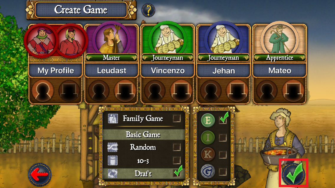 各プレイヤーが10枚の中から職業・小進歩を7枚ずつ選ぶ形式です。